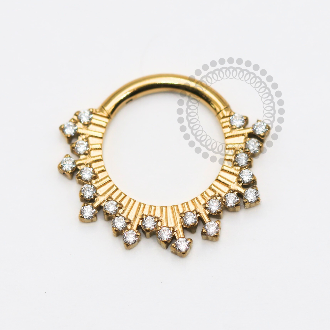 Titânio PVD Gold: O titânio PVD gold é um material altamente resistente, ideal para piercings devido à sua durabilidade e segurança. Ele recebe um revestimento dourado através do processo PVD (Physical Vapor Deposition), que garante cor intensa e longa duração. Hipoalergênico, é perfeito para peles sensíveis, evitando irritações. Além disso, é elegante e de alto desempenho.