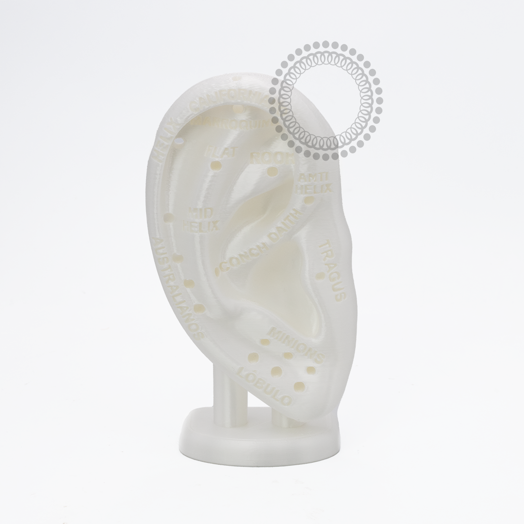 Descrição: Este modelo de orelha é produzido em plástico/resina através de impressão 3D, garantindo leveza e resistência.