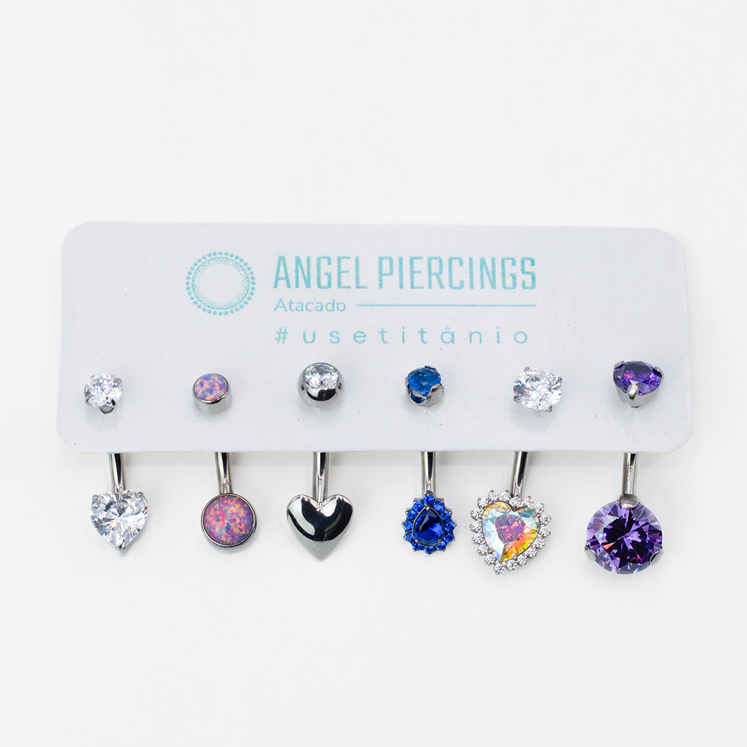Descrição: Os kits promocionais Angel Piercings oferecem uma seleção exclusiva de joias, combinando estilo e qualidade, e um preço incrível. Cada kit é cuidadosamente elaborado para perfurações de umbigo,as joias tem rosca interna, proporcionando uma fixação segura e prática. Essa característica facilita a colocação e remoção das joias, garantindo conforto e versatilidade no uso. Perfeito para profissionais piercers que desejam diversificar suas coleções.
